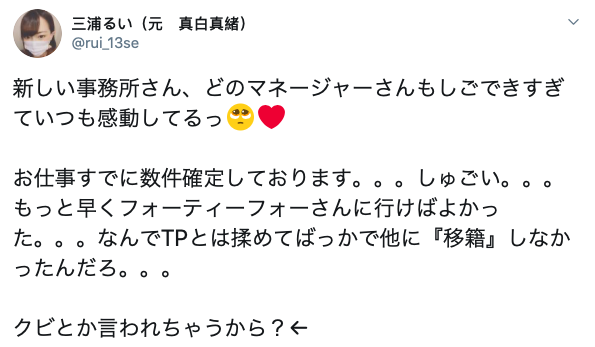 有了新的事務所,當然免不了要酸一下之前的經紀公司:現在叫三浦るい(三浦瑠衣)的她馬上發推讚現在的經紀人能力很強,已經搞定了好幾個工作,早知道就趕快移籍去44 Group了,幹嘛一直和T-Powers爭執呢?