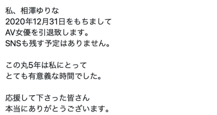 邪惡帝國S1出道、號稱是「パーフェクトボティ(Perfect Body,完美肉體)」的現役外資系OL(外資企業上班族)相澤ゆりな(相澤友梨奈)剛剛宣布引退,2021年,她就要卸下AV女優的身分了: