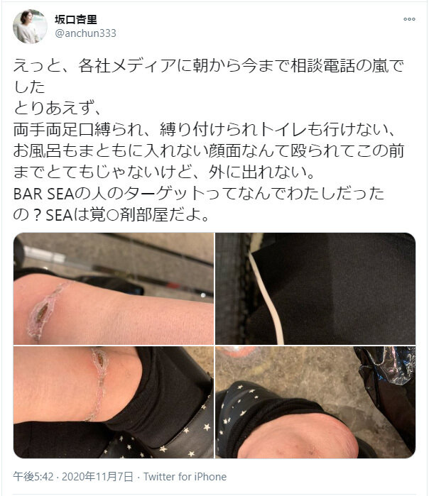 被人家這樣對待的是日本演藝圈知名的星二代、也是曾經在AV界掀起一陣熱潮的「坂口杏里(在暗黑界發片的時候是叫ANRI)」:她說自己被綁了起來、無法行動、還被毆打,最後還點名自己上班的酒吧有人吸毒⋯