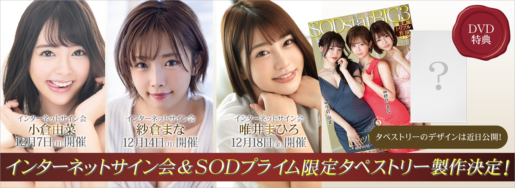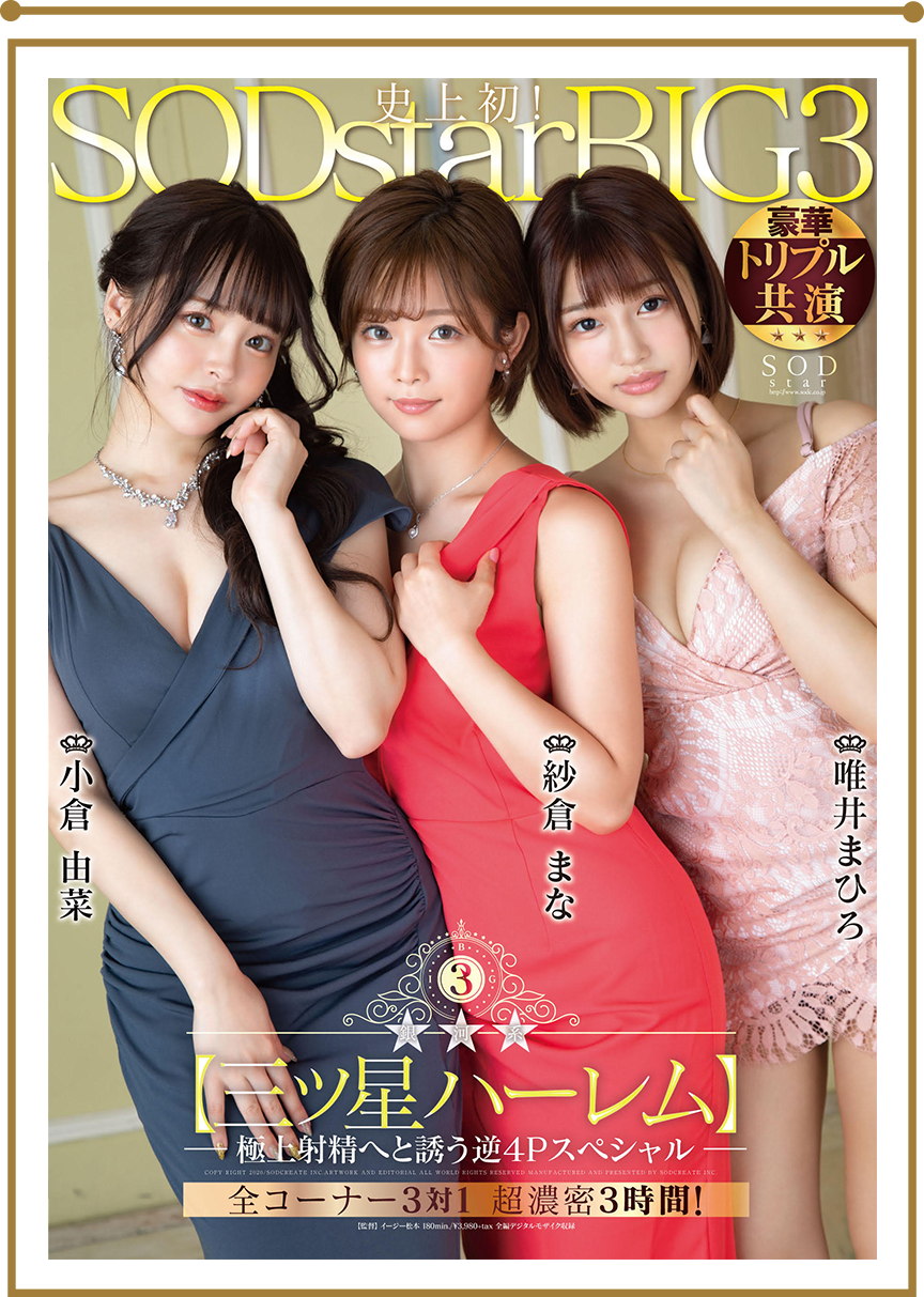這樣的陣容讚不讚?不過這支作品和今年Beauty Venus的組成過程不太一樣:倒也不是跨片商比較麻煩,而是處理女優的方式不一樣,之前曾提過有些女優天生比較內向不喜歡和其他人交流、有些女優則是規矩很多還有些女優是在意輩分問題然後片商還必須考慮女優外型搭不搭,像快170公分的橋本ありな(橋本有菜)如果搭到不到150的夢乃あいか(夢乃愛華)那真是怎麼想怎麼怪⋯但SOD STAR這支共演完全沒這問題,三位女優紗倉まな(紗倉真菜)、小倉由菜及唯井まひろ(唯井真尋)是同一家事務所的學姊妹,交給經紀公司自己去喬就好了⋯
