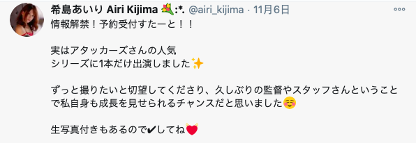 所以這支作品的重點就是希島あいり(希島愛里)是不是離開了Madonna?畢竟封面打上了「専属」兩字,看來移籍似乎成了定局。這位愈來愈漂亮的資深女優也知道大家都好奇自己的動態,所以特別在Twitter上解釋了一番: