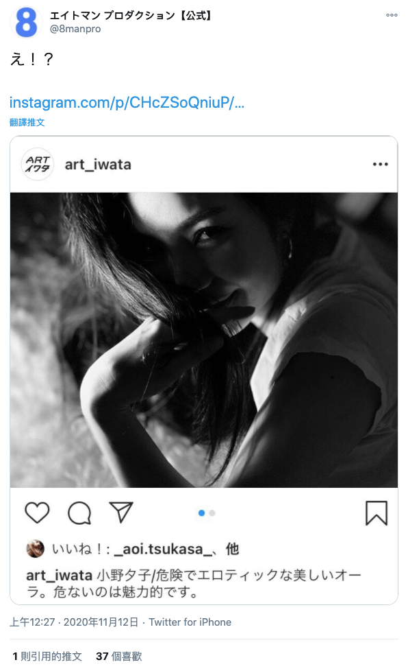 首先,事務所轉推的是ARTイワタ的IG,那是個製作寫真的團隊,小野夕子剛復出時發售的數位寫真就是由這個團隊負責的,所以她出現在那兒並不奇怪,重點這是這張照片是當時的現場紀錄還是最近合作的翦影?