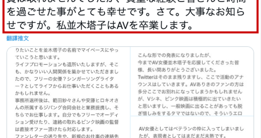 等到一切安頓好了並木塔子還打算往音樂的方向發展:看到這兒你應該明白了,AV引退的消息出來後有人留言和我說並木塔子可惜了、始終沒有到達熟女界的頂峰,但我卻認為那不是她要的,也許剛出道的時候她真的想成為熟女界的高手高手高高手,不過這些日子來她的布局就不是要在AV界衝刺而是尋找未來的更多可能,而現在,很顯然地,雖然肺炎影響了工作但也加速了她布局的進度,所以這位優質熟女很乾脆地在參加完昨天スカパー!アダルト放送大賞2020的頒獎後宣布不玩了: