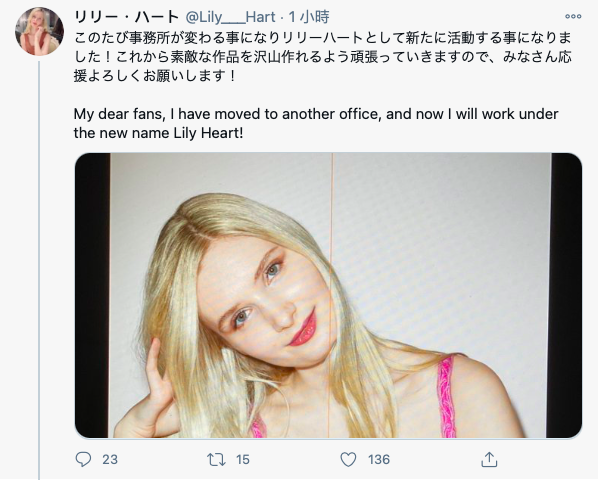 現在的她叫做リリー・ハート(Lily Hart),雖然才發沒幾支作品就換經紀公司不太正常,但以日本人的個性寫出來了就是塵埃落定,不會有什麼我要去湖人了然後刪文了變七六人的事發生。而我也非常期待她的發展,因為印象中好像沒有洋將去當企劃女優和人家拼發片的,而且我也想知道T-Powers究竟法力無邊到什麼程度,雖然我認為這家經紀公司還是會想辦法替這位洋將找個專屬女優的位置來做⋯
