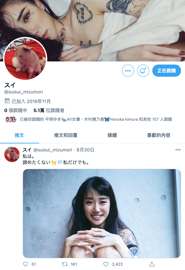 先來回答某位朋友的問題,對,水森翠已經沒了,雖然還保留twitter(https://twitter.com/suisui_mizumori)但她不但把之前的發文全刪了而且也拋棄了水森翠之名,現在的她叫スイ(Sui、翠的讀音),是一個已經離開經紀公司的前AV女優,未來會不會復出就再看看吧。