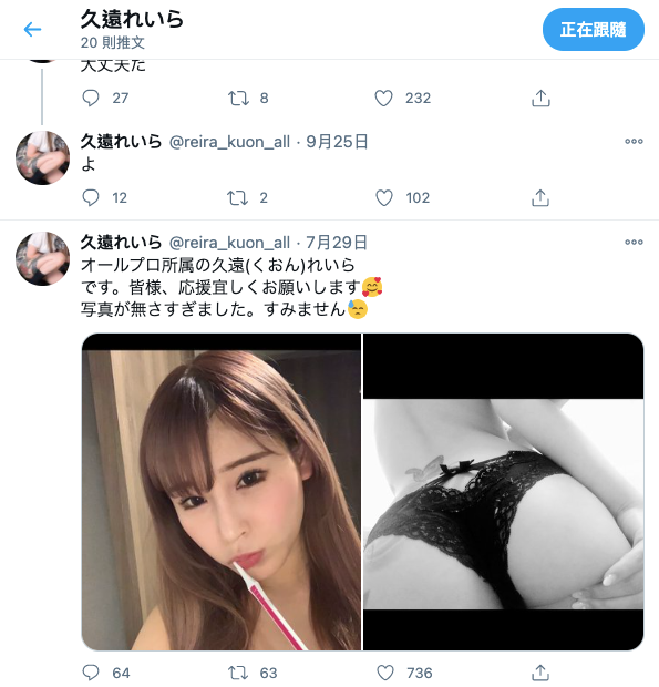 看著她twitter只有兩篇,一篇自我介紹一篇說自己充電完成要好好打拼結果現在是半休業狀況真令人唏噓。狀況比較好的是佐藤エル(佐藤愛琉),twitter還有更新也固定有新片產出,暫時不用擔心看不到她〜