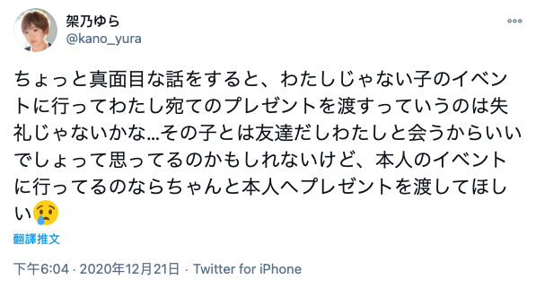 才介紹她女扮男裝作品的架乃ゆら(架乃由羅)在twitter上寫了,請影迷不要去參加其他人的活動然後託那位女優把禮物交給自己,不管架乃和那位女優有多熟都不行⋯
