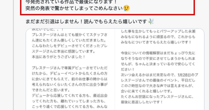 這真是太詭異了,一直沒發片的河合あすな(河合明日菜)沒事,反倒是規律發片的永瀬みなも(永瀨未萌)被打分手炮了—雖然說天底下無不散的宴席,但你好歹也在作品封面提醒大家那是永瀬みなも(永瀨未萌)的畢業作吧?結果什麼都沒有就讓她自己在twitter宣布,感覺裡面有卦啊:
