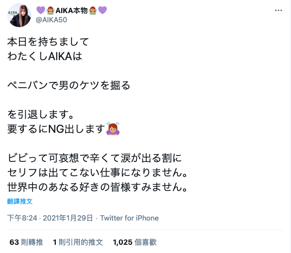 著名的辣妹女優AIKA是在Twitter發文,由於文章裡面提到了「引退」兩個字,讓許多影迷有些緊張,難道她不幹了嗎?