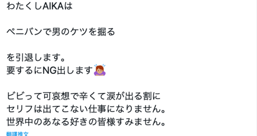 沒有啦,這邊的「引退」指的不是AIKA不做女優了,而是她自此退出某種類型的演出:是什麼類型的演出呢?答案就是ー