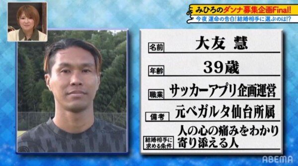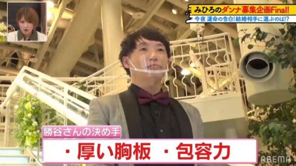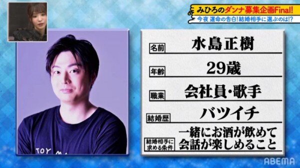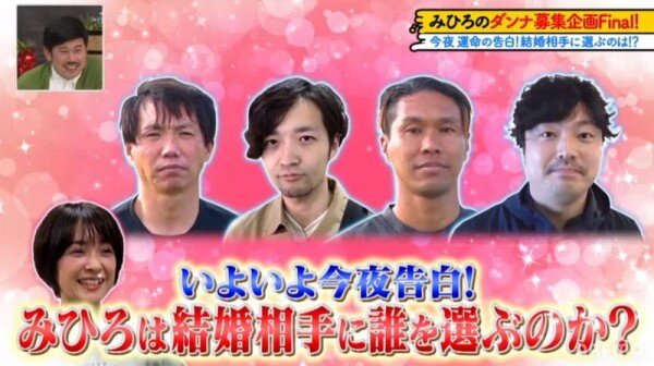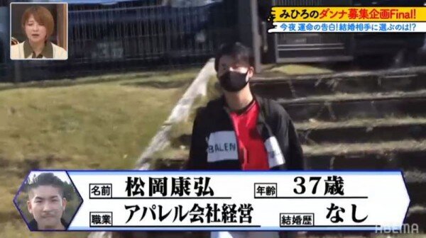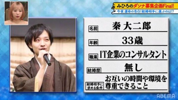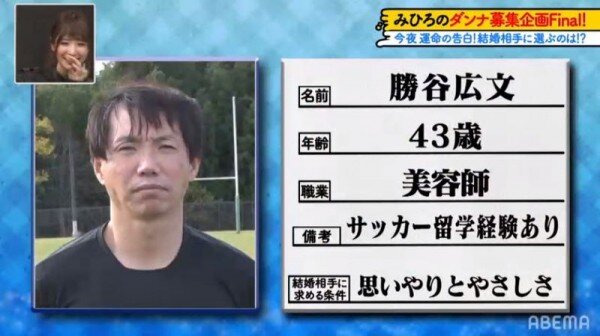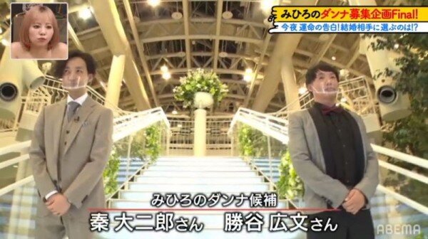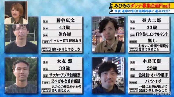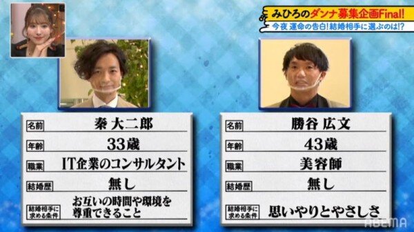 みひろ(Mihiro)最後是選出資訊產業的顧問(33歲)及美容師(43歲),兩人都沒有結過婚,一者年輕、長得有型而且年收入破千萬円(約新台幣268.5萬,資訊產業顧問);另一者年長、有包容力而且收入也不差有600萬日幣(約161萬台幣,美容師):