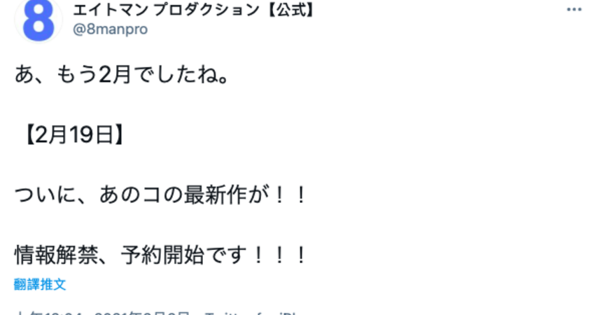 首先要關注的還是事務所エイトマン(8Man),他們在凌晨時更新了官方Twitter、告訴大家2月19日有個女孩的最新作品就要情報解禁,請大家記得預約: