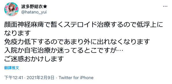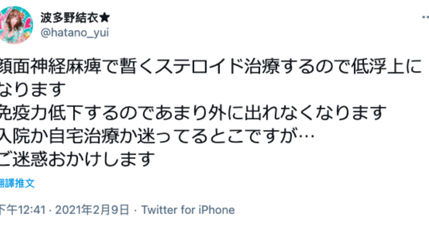 這位AV界的長青樹是在前天(2/9)的時候和大家報告這個消息的ー就她的說法,她現在舌頭有麻痺感,臉也不太對勁,目前正在接受類固醇治療,暫時不能出門⋯