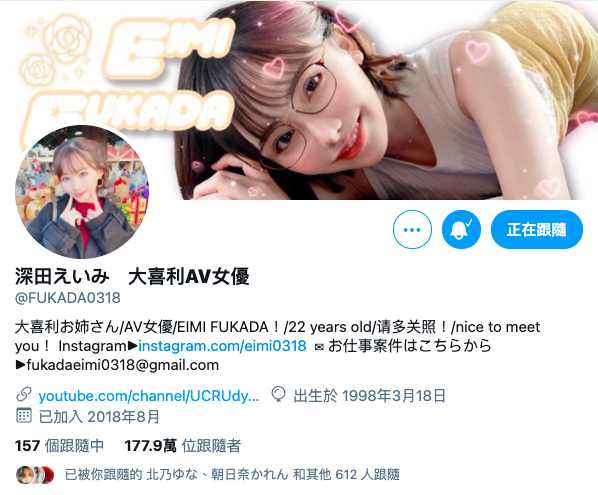 在昨天又多了兩萬人追蹤後,深田えいみ(深田詠美)的twitter目已經有了177.9萬的追蹤,距離已經退役的時尚教主明日花キララ(明日花kirara)只剩下不到1.5萬的差距⋯