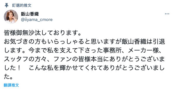 有「令和最初の大型新人」之稱的人妻系女優「飯山香織」是在昨天宣布了引退的決定,除了感謝事務所、片商以及影迷的支持外,她也公布了新的twitter帳號(https://twitter.com/AneJ97607312),會持續更新向大家報告自己的近況⋯