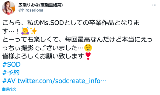 其實片商要做新陳代謝也沒什麼,更何況広瀬りおな(廣瀨里緒菜)待這麼久了也夠本了,卒業真的沒必要大驚小怪,更何況她背後的事務所正想多培養幾台發片機器呢。但問題是広瀨這一走她所屬的片商Ms.SOD就只剩下兩位女優,雖然本來就不是什麼大型片商,但你還記得SOD一開始是希望這牌子能成為SOD Star、也就是集團最頂尖片商的對手嗎?現在這樣的做法只怕沒多久Ms.SOD就要滅團了⋯