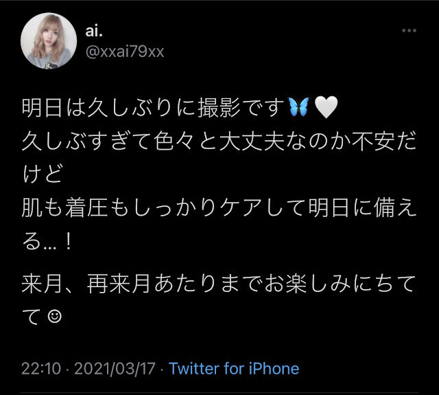 哪裡有意思呢?且讓我不帶任何情緒,照字面翻譯這篇發文:這位名叫「ai.」的女孩說明天(3/18)即將進行久違的攝影,因為太久沒拍所以有些不安,為了表現到最好,所以她已經做好皮膚保養和防水腫的工作,下個月,還有下下個月請大家期待她的作品〜