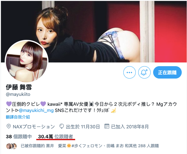 要不是有個怪物叫深田えいみ(深田詠美),要不然伊藤舞雪真的是可以說是社群女王ー30萬的追蹤數字代表什麼?意思就是S1這家最頂尖的片商只有三上悠亜贏過她,其他包括在S1待最久的夢乃あいか(夢乃愛華)、新世紀性愛戰士坂道みる(坂道美琉)以及另一個很會搞社群的ひなたまりん(日向真凜)都被她遠遠甩到後頭去了⋯