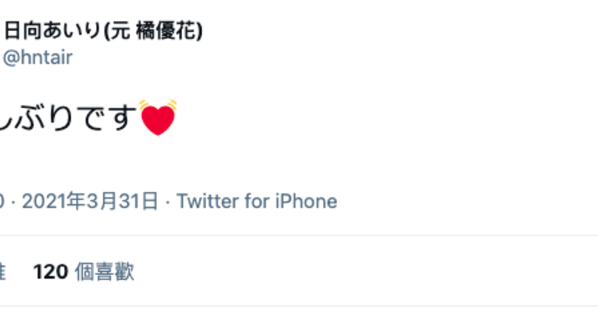 對,我的意思就是不要太期待,雖然日向あいり(日向愛理)和大家說了「好久不見」,但她可沒說什麼時候在淫光幕上再見,所以或許這是為回歸拍片起個頭,但也或許只是發現手機的twitter還可以登入就順手發個文: