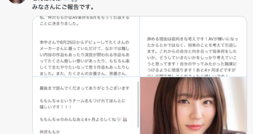 理由和本上麦一樣,就是雖然入行以來做得很開心,但待到現在也夠了,是該思索下一步的時候了ー雖然到目前還待不到一年的時間,但仲沢ももか(仲澤百華)這樣說也不能算錯,AV女優不能做一輩子,現在甚至連做個兩三年都不容易,與其被這個環境淘汰,自己喊退不會丟臉的⋯