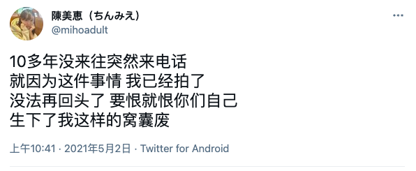 我幾乎每天都會去看陳美恵的發文和留言,之前我一直以為她背後有人在操盤,但看到她沒工作為生活所苦就覺得不是這麼回事,現在又看到她被爸媽發現拍片的事情,想必她會覺得人生很艱難吧?