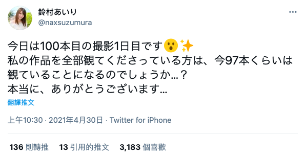 對,就像夢乃あいか(夢乃愛華)之於S1、鈴村あいり(鈴村愛里)也在Prestige要拍滿100支作品了,我們都知道她是專屬女優,除非有特別任務否則一個月就是1支作品,累積到現在也是8年多的時間(2013.2〜),這成就真的得來不易,因為這意味著她賣座不差讓片商願意一直留著、而且身體健康又一直撐下來沒轉行,一般的女優很難做到的: