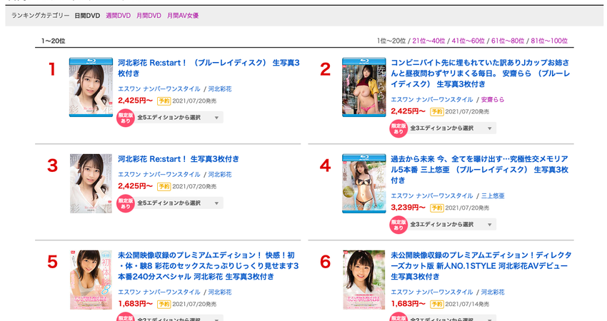 昨天最大的新聞就是河北彩花回歸戰線,S1替她設計了一個空前絕後的促銷計畫ー結果你看看河北有多猛,今天的銷售排行榜她不只拿下銷售第一(藍光)和第三(DVD),就連2018年上市、附上未公開影像的作品也名列第五第六名⋯