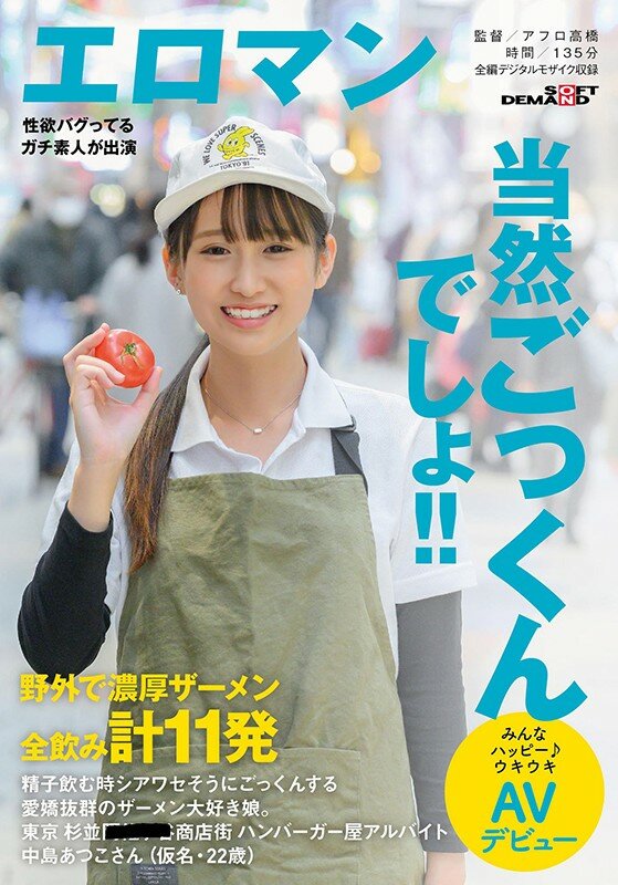 有多想幹呢?這支「精子飲む時シアワセそうにごっくんする愛嬌抜群のザーメン大好き娘。野外で濃厚ザーメン全飲み計11発 東京 杉並 ■■商店街 ハンバーガー屋アルバイト 中島あつこさん(仮名・22歳)みんなハッピー♪ウキウキ AVデビュー」是近期最大膽的作品之一,倒不是演出的中島あつこ(中島敦子)有多敢玩,,而是我不知道為什麼一個煎漢堡的企劃寫一寫會跑去打野炮: