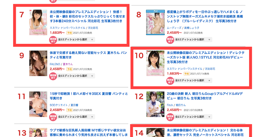 有多厲害呢?在昨天公布的6月通販DVD的排行榜,河北彩花一個人在前20名占了6個位置,分別是冠軍(回歸作的藍光版)、第四(回歸作的DVD版)、第七第十第十四第十七(之前作品附上未公開影片的版本)ー相信大家都知道S1為什麼這麼看重這位女優要用那麼高規格的行銷手法,因為她・值・得〜