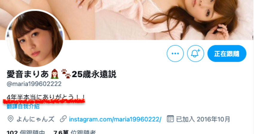 對,那麼多「又」就是因為愛音まりあ(愛音麻里亞)之前狀況不少,不過這次讓她把twitter自我介紹欄改得那麼不吉利的原因是什麼呢?我想應該是之前這篇推文:
