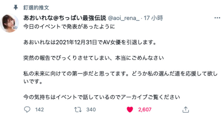 在昨天慶祝出道6週年的活動上(她是2015年7月25日於片商kawaii*出道),有貧乳界霸主之稱的あおいれな(葵玲奈)宣布做到今年為止ー12月31日,就是她在AV界的最後一天了,2022年,她就要卸下あおいれな(葵玲奈)的身分了⋯