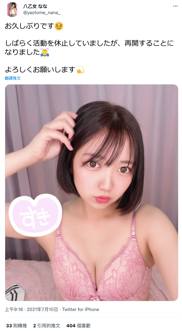 距離上次更新已經超過半年,八乙女なな(八乙女奈奈)只說她是「活動休止」,並沒有多加解釋發生了什麼;然後她也發現自己的twitter在這半年的時間掉了400個追蹤者,所以她說要好好加油,把流失的人氣找回來〜