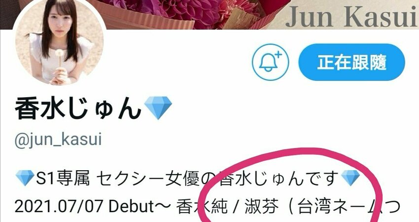 片商S1的新人「香水じゅん(香水純)」昨天是在twitter的自我介紹欄加了這麼一句「淑芬(台湾ネームつけてもらいました)」,意思是她被給了個台灣名字「淑芬」: