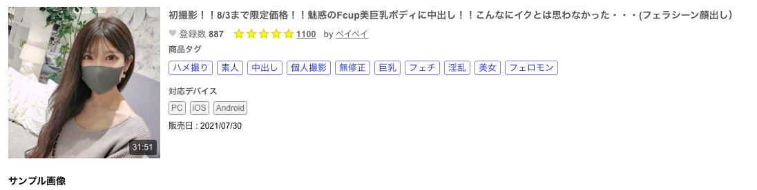 作品是前天(7/30)放出的「初撮影!!8/3まで限定価格!!魅惑のFcup美巨乳ボディに中出し!!こんなにイクとは思わなかった・・・(フェラシーン顔出し)」,番號FC2-PPV-1946644,從標題和劇照就知道這是一支女優戴口罩演出的作品,不過在口交的時候女優有把口罩完完全全地拿下來,然後看著她大吃一精的我也大吃一驚了: