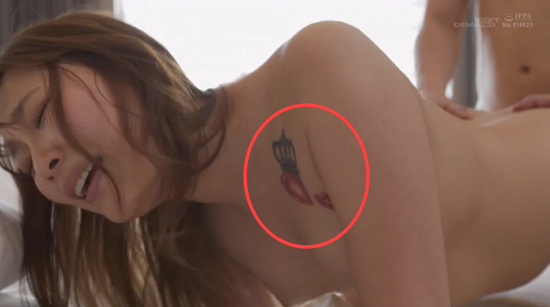 因為很大一塊,用膠帶或撲粉都遮不好,所以SOD人妻系列只能讓她用頭髮擋一下,真的露出來就算了。我是不知道她之前是不是真的在辣妹系的雜誌當模特兒,但以日本人對刺青的態度來看她不但真的辣,搞不好還「混」過⋯