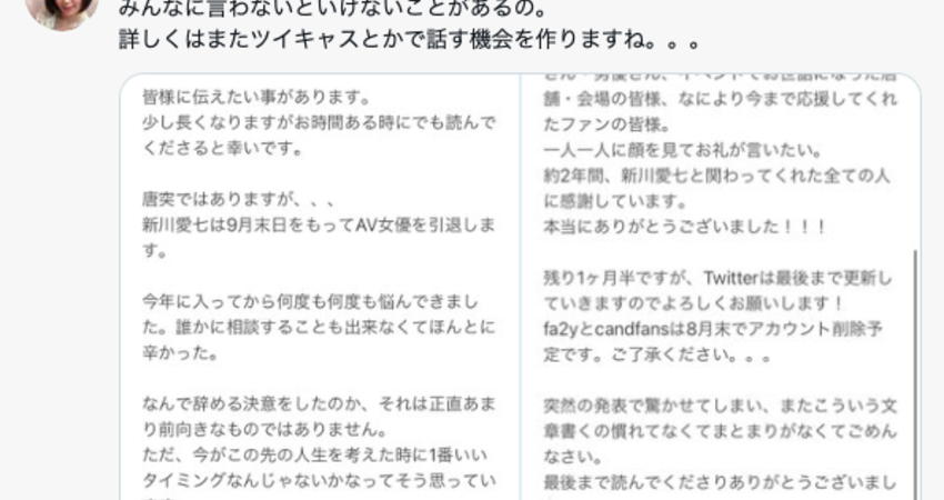 這消息來得突然,不過新川愛七已經下定決心了:twitter只更新到9月底,粉絲俱樂部則是會在8月底刪除,所以期待她只是AV引退然後繼續搞粉絲團和大家互動的影迷可以死心了,這是完全引退,9月底後她就會消失得什麼都不剩⋯