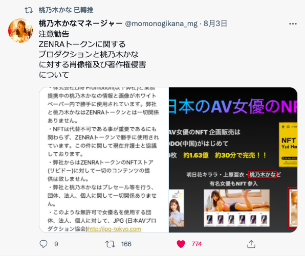 有多瘋?基本上廠商是拿著大把鈔票在日本找人,女優只要twitter追蹤數破十萬都有機會做NFT商品。也因為NFT太熱所以出現兩種怪現象,一個是出現盜版業者,前陣子大家應該還記得桃乃木かな(桃乃木香奈)在twitter發文要大家注意別買到盜版的NFT(有趣的是NFT本來就是為了防止盜版而生),再來,NFT熱鬥的狀況好像是見者有份,就連松本いちか(松本一香)都有ー