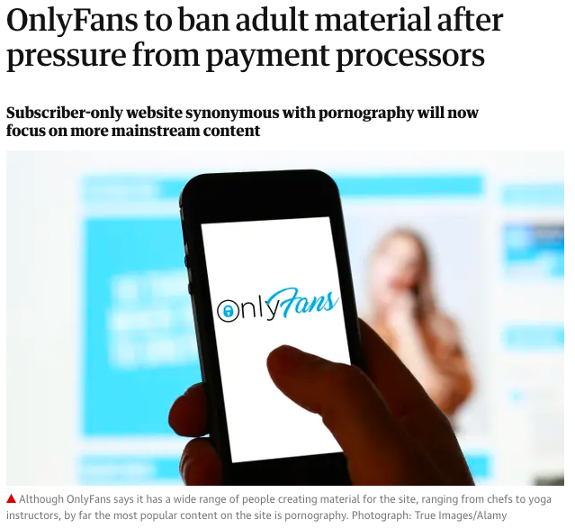 因為Only Fans平台宣布將從10月開始禁止上傳色情影音,最多只接受單純裸露的照片ー沒辦法,因為被銀行威脅要斷金流,為了活下去只能轉型,只是失去成人影音的Only Fans還能活多久也是個問號⋯