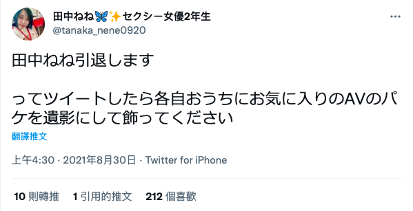 今天不是愚人節,所以田中ねね(田中寧寧)也不是在開玩笑,她的意思是如果有朝一日如果她引退了,那請大家把她作品的封面PO在twitter上當紀念⋯