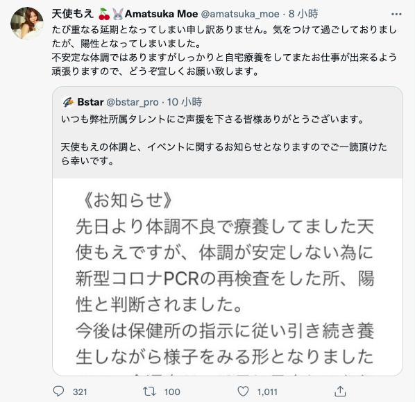 這是BStar第二位成員確診了,之前是沒有拍AV的小夏つむぎ(小夏紬),雖然年紀很輕但她的狀況蠻嚴重的,拖了很久還沒好;而天使もえ(天使萌)確診除了要祝她早日康復外也要密切關注擴散的狀況,因為不只8月28日有實體活動接觸了很多人,隔天她還在社長家裡直播,那時不只社長還有另一個經紀人在場,經紀人如果又去帶其他女優的話⋯