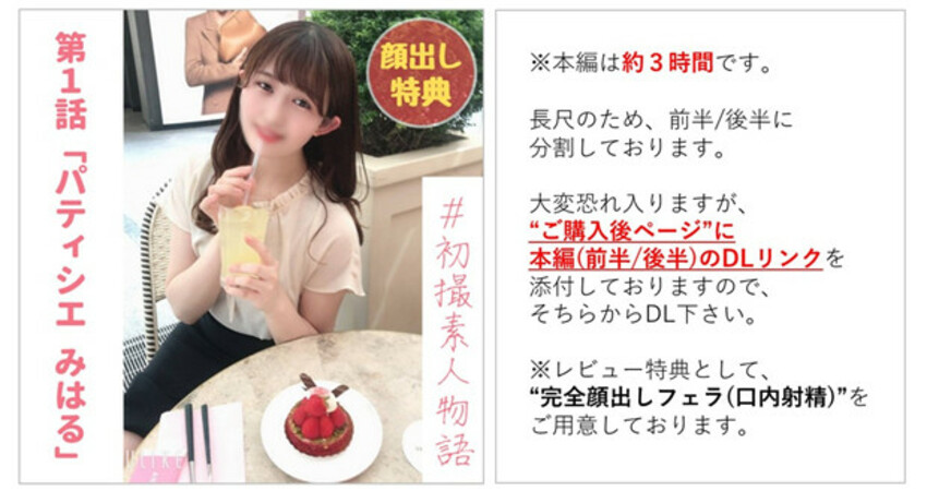 タイトル: 【無】【完全初撮り】将来有望 努力家パティシエに芽生えた愛情 ゴム外し人生初生中出しを経験【本編約3時間】【完全顔出しフェラ(口内射精)特典あり】10