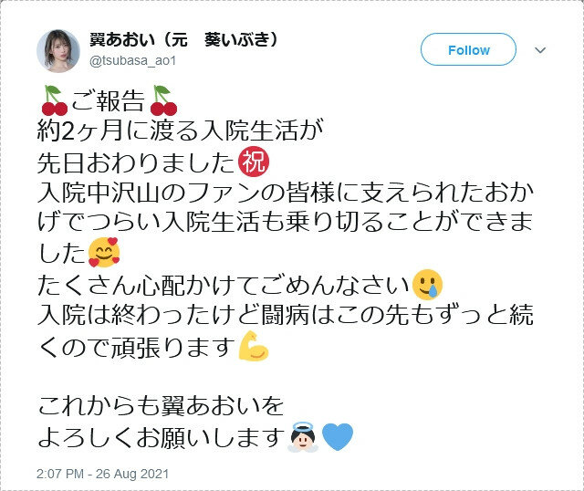 其實她不久前(8月底)才剛出院,病得挺厲害的,住院住了兩個月,據說那時她就有引退的念頭,後來是在事務所勸說以及看到twitter上影迷為自己加油後而打消念頭;只是沒想到一個月不到她還是選擇離開,這也讓我們懷疑了,她還要不要待在這一行啊?