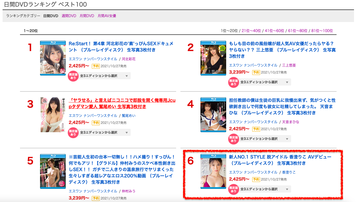 第一名是河北彩花,第二名是三上悠亜,前十名這片商占了七個位置,如果還有人懷疑S1不是AV界最頂尖的片商你就貼這份榜單給他看吧(換言之,能打進前十名的白石媽媽和Julia也真的很強)⋯