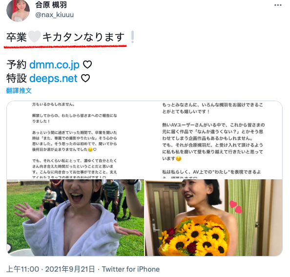 沒錯,這支感謝祭的作品看似合原槻羽的生涯巔峰,卻也是她與片商Deep’s最後一支專屬合作的片子,她已經在twitter上說了,之後就要以企劃女優的身分繼續努力: