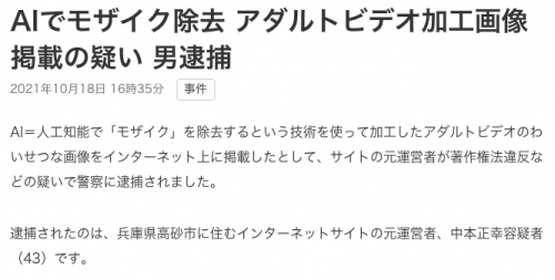 這是日本第一次有人因為「馬賽克破壞版」的片子被捕,就新聞內容來看,嫌犯的做法就和我之前講的一樣,馬賽克破壞並非是解除馬賽克讓你看到原來的東西,而是利用AI模擬馬賽克後的風景,他前後共製作了超過一萬支作品,警方目前正在調查銷售管道,案子有進一步擴大的可能〜