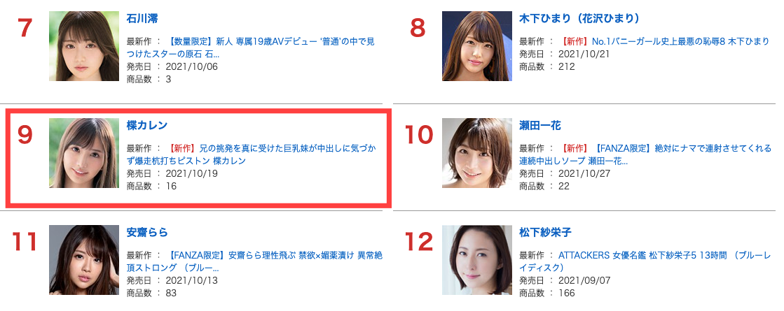 在2021上半年度的銷售排行榜她一個人就有兩支作品打進前10名(通販部門),就算是出道超過半年的現在,她這個月的作品「兄の挑発を真に受けた巨乳妹が中出しに気づかず爆走杭打ちピストン」依舊有作品通販第9,女優累積排行也第9的水準,我可能要修正一下,楪カレン(楪可憐)不只有能力爭取上半年度的最優秀新人,甚至2021一整個年度的最優秀新人都不能忘了她ー所以這時候出來第二家片商分一杯羹也很正常吧?