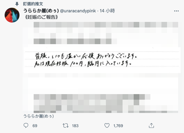 首先是她竟然不做了,因為うららか麗(麗日麗)算是蠻常更新twitter的,所以看到她丟出引退聲明我有點小驚訝;而讓我大吃一驚的是引退聲明的內容,うららか麗(麗日麗)告訴大家她已經懷孕10個月、即將臨盆了〜