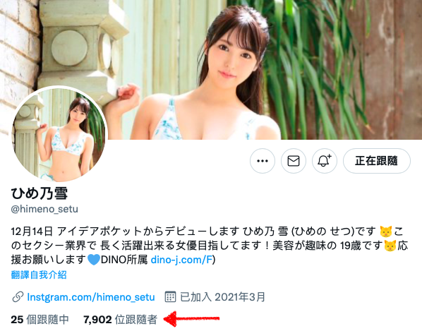 先來解釋一下這位新人的藝名,她的姓是「ひめ乃(姬乃)」,名字是「雪」,而且「雪」的讀音不是大家熟悉的Yuki而是Setsu,如果有朝一日她來到台灣請大家不要喊錯了。而這位新人很早就在社群上現身了,3月,她就有了twitter,在大家推來推去後在正式出道的昨天就已經有接近8000個追蹤了⋯