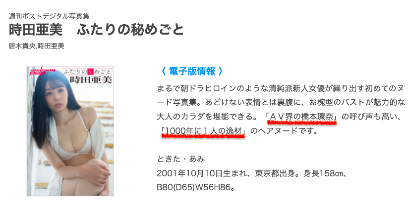 比照最近幾位大型新人,時田亜美(時田亞美)是先在雜誌「週刊ポスト(週刊Post)」拍攝寫真,而且你看人家是怎麼宣傳這位暗黑界的新人?「AV界的橋本環奈」、「1000年才有一位的高手」,感覺真的很厲害呀~