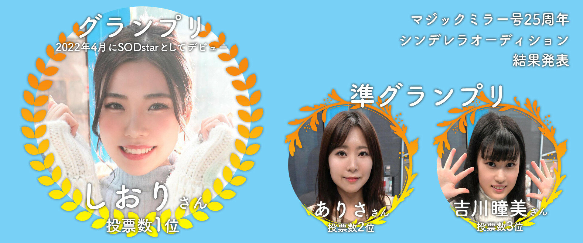 是誰呢?是我在上一篇介紹參賽者時說要投給她的8號「しおり(詩織)」,SOD集團承諾將會讓她在2022年4月以SOD STAR專屬女優的身分出道;值得注意的是這個票選還有兩個亞軍,一個是37歲、小孩大了想展開新人生的「亜莉紗」,另一位則是當過偶像、想要把自己變成大奶妹的歸國子女「吉川瞳美」: